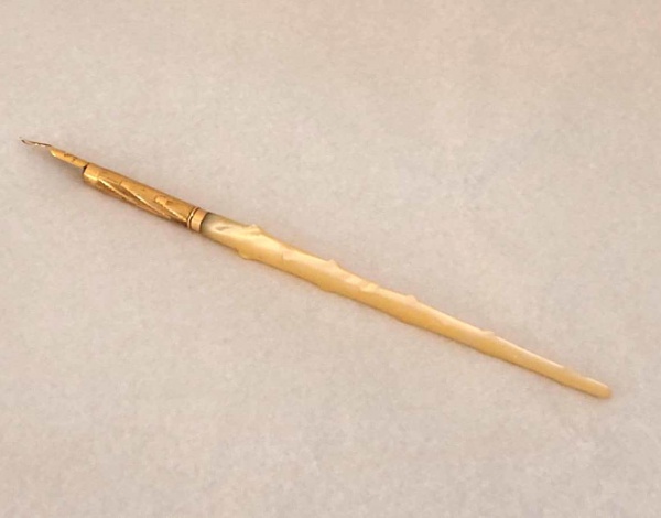 • Caneta pena com haste em madrepérola e ouro. Medida: 15 cm.