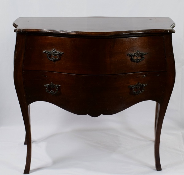 • Comoda bombée em madeira nobre com 2 gavetas e puxadores em bronze. Medidas: 100 cm x 45 cm. Altura: 90 cm.