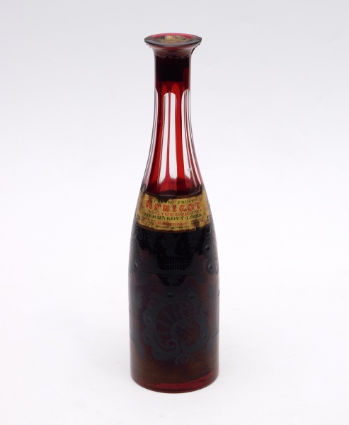 • Garrafa/licoreira em cristal da Bohemia na cor vermelha. Garrafa com a bebida original (Licor de Apricot francês) lacrada. Não possui a tampa. Altura: 32 cm.