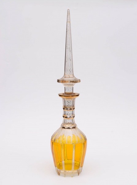 • Grande garrafa/licoreira em cristal Tcheco com rico trabalho em ouro. Pequeno bicado na borda e colada na ponta da tampa. Altura: 72 cm.