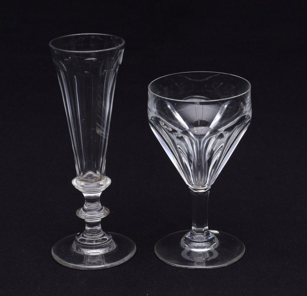 • Dois copos em cristal Baccarat, com lapidações diferentes. Uma das taças possui a marca  gravada. Medidas: