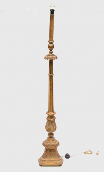 • Tocheiro de madeira dourada adaptado para luminária. Altura total: 157 cm.