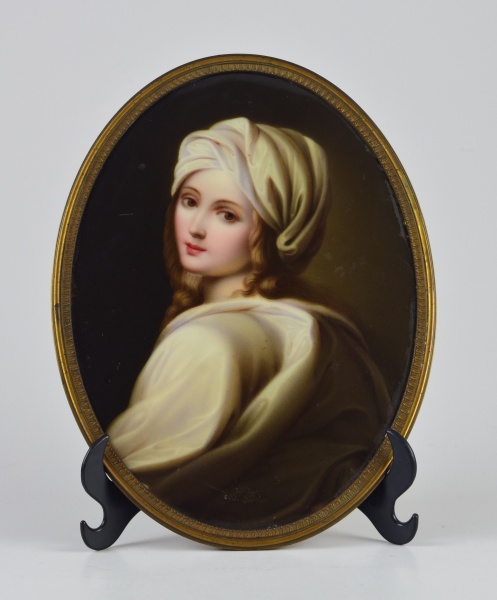 • Placa oval em porcelana europeia em moldura de metal dourado. Pintura representando figura de dama. Largura: 15 cm x Altura: 20 cm.
