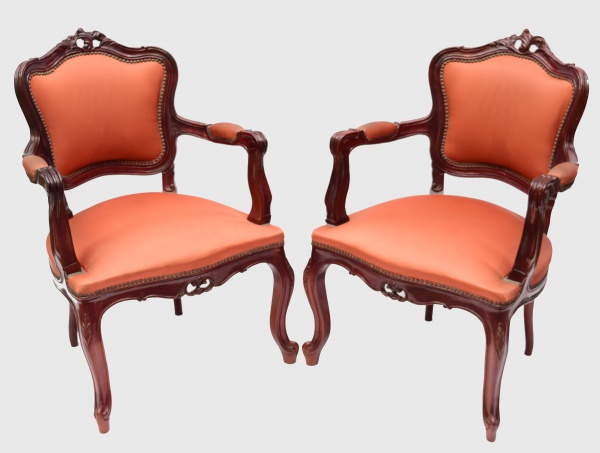 • Par de cadeiras de braços, poltronas, estilo Luis XV em madeira nobre e estofadas em tecido na tonalidade cereja. Largura: 65 cm. Altura do encosto: 93 cm.