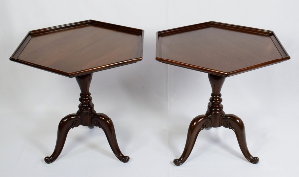 • Par de mesas laterais sextavadas em madeira nobre. Medidas: 66 cm x 76 cm. Altura: 70 cm
