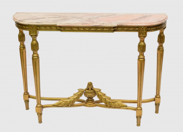 • Console dourado estilo Luis XVI com tampo em mármore. medidas: 115 cm x 33 cm. Altura: 80 cm.