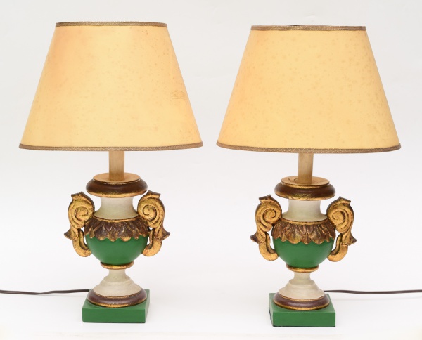 • Par de antigos abajures, no formato de ânforas, em madeira policromada. Possui cúpulas ovaladas. Medida da base: 10 cm x 10 cm. Altura sem cúpulas: 35 cm. Altura total: 50 cm.