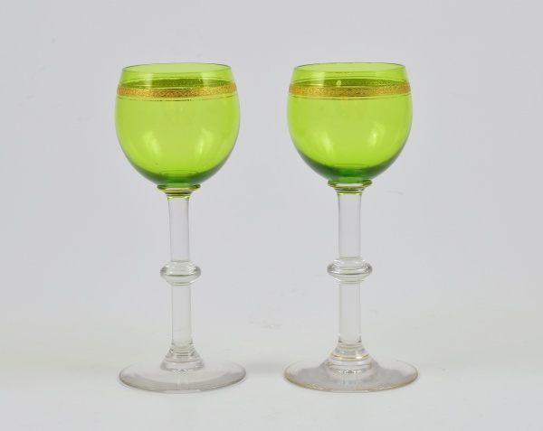 • Par de taças de cristal Saint Louis na tonalidade verde com friso de ouro na borda. Altura: 18 cm.