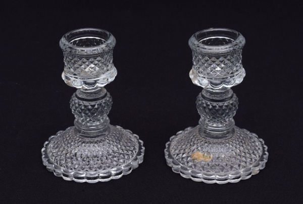 • Par de castiçais em demi cristal lapidação ao gosto Baccarat "bico de jaca". Diâmetro da base: 12 cm. Altura: 15 cm.