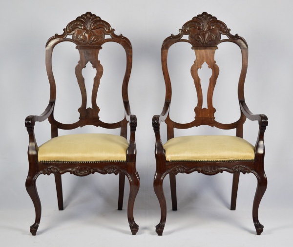 • Par de cadeiras de braço em jacarandá, estilo D. José, com assentos estofados em tecido bege. Altura do encosto: 130 cm.