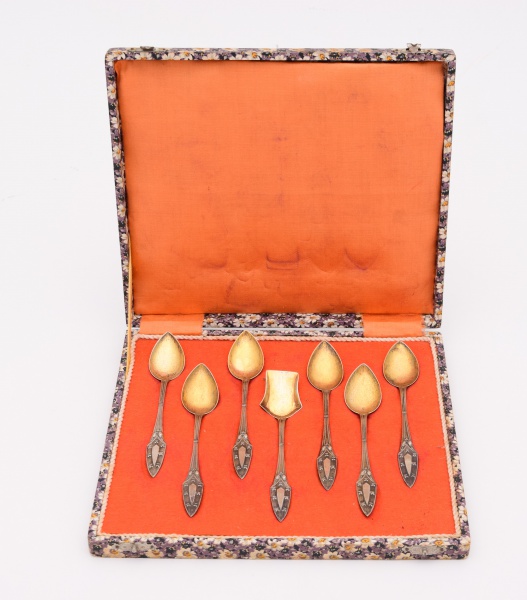 • Jogo de sete colheres para chá em prata contrastada, teor 833. Acondicionadas em estojo. Peso: 58 gramas.