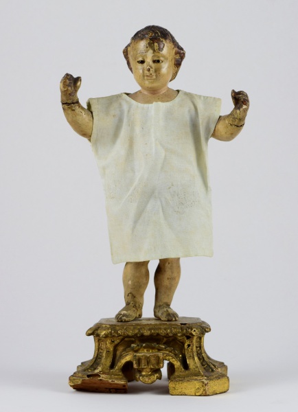 • Imagem de Menino Jesus em madeira policromada sobre base dourada. Portugal, século XIX. Altura: 31cm. Faltam alguns dedos em ambas as mãos e apresenta sinal colagem nos 2 braços.