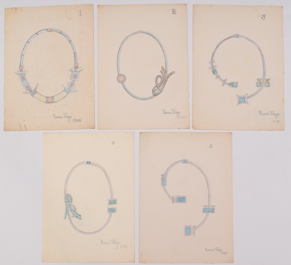 • NANÁ VIEGO (Cuba 1928 - Rio 2011) - Conjunto de 5 desenhos (design de joias) aquarelados sobre cartão - Assinados no c.i.d., datados 1985. Medidas: 35 cm x 15 cm (cada).