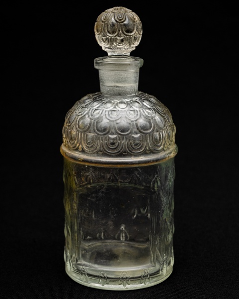 • Vidro de perfume Guerlain. Bicado na borda. Altura: 16 cm.