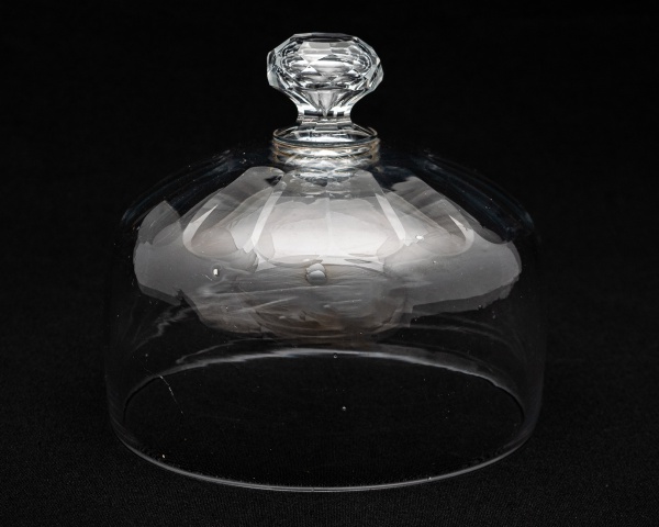 • Tampa de queijeira em cristal francês Baccarat, lapidação "dedão". Diâmetro da base: 17,5 cm. Altura: 15,5 cm.