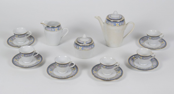 • Conjunto para café em porcelana Germer composto de 6 xícaras com pires, bule, leiteira e açucareiro. Porcelana predominantemente branca com decoração floral e friso de ouro na borda. Altura do bule: 18cm.