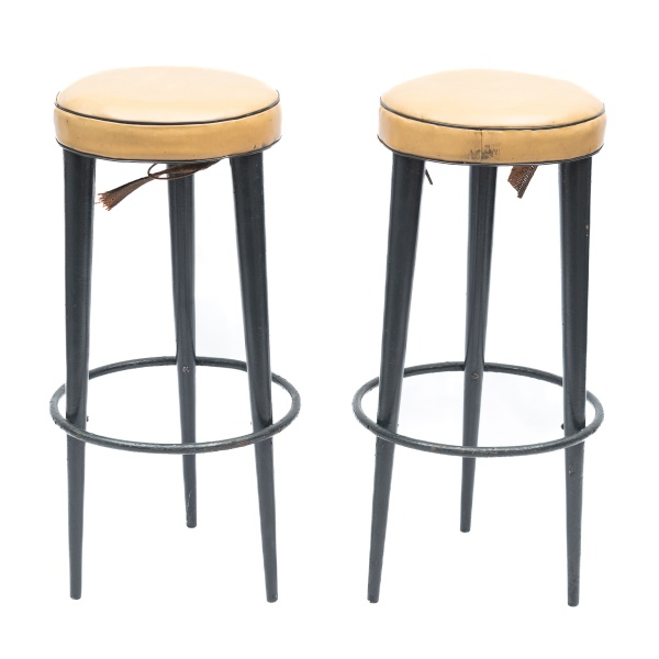 • Par de baquetas de ferro com assento em couro. Anos 60. Altura das banquetas: cm