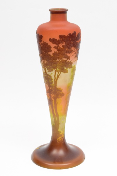 • EMILE GALLÉ (França, 1846 - 1904) - Vaso em pasta de vidro acidado, cameo glass, com desenho floral. Assinado no bojo. Medida: 23 cm.
