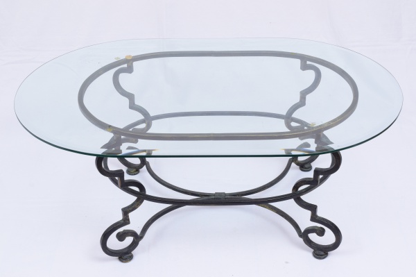 • Mesa de centro oval com pés de ferro e tampo em espesso cristal bisotado. Medidas: 70 cm x 110 cm. Altura: 45 cm. ATENÇÃO: RETIRADA COM AGENDAMENTO NA Av. VISCONDE DE ALBUQUERQUE (LEBLON).