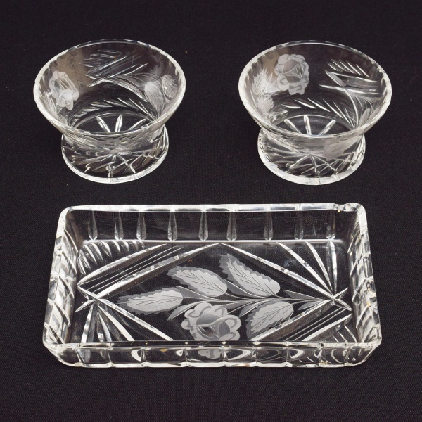 • Bandejinha de vidro com pequeno bicado na borda medindo 19 cm x11 cm e 2 bowls para petiscos em vidro medindo 10 cm de diâmetro x 6 cm de altura