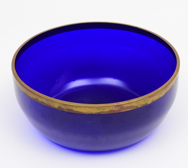 • Bowl, fruteira, em vidro azul com borda em metal dourado. Diâmetro: 20 cm. Altura: 9 cm.