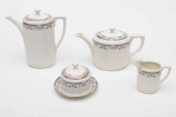 • Conjunto de chá com 4 peças em porcelana da marca ALTWASSER SILESIA, composto de: bule de café (22 cm), bule de chá (16cm), leiteira (8 cm) e açucareiro (11 cm). Bule de chá trincado no corpo.