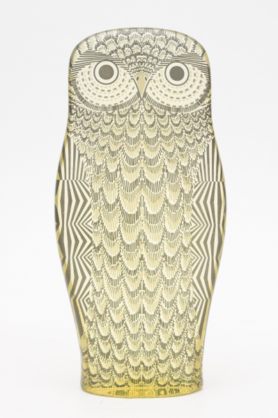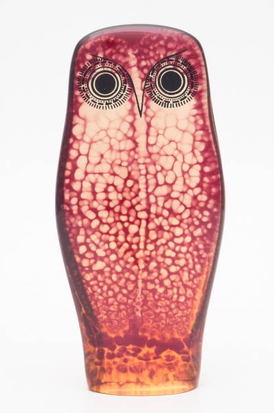 • Abraham Palatnik (Natal, 19 de fevereiro de 1928 - Rio de Janeiro, 9 de maio de 2020) - Raríssima escultura cinética da série especial no catálogo do artista representando coruja em resina de poliester decorada com a técnica "BURUNDI" (efeito obtido quando da pigmentação da resina). Assinada por extenso na lateral inferior e com selo de exportação na base. Obra rara e de coleção com alto brilho, em perfeito estado original de conservação.  Ex coleção do escultor José Pedrosa (amigo pessoal de Palatnik). Década de 1970. Medidas: 18 x 10 cm.