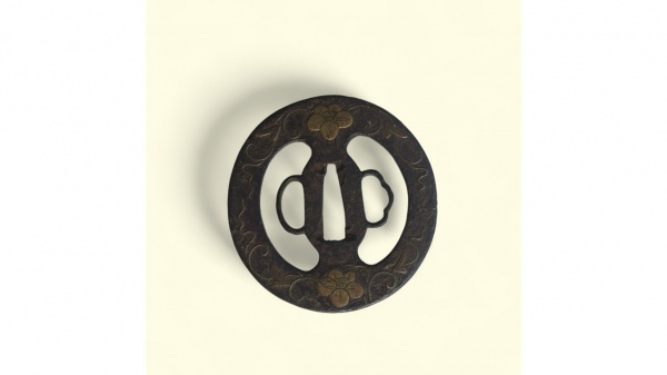 • Raríssima Tsuba guarda, ou proteção de mãos. Disco de ferro utilizado em espadas japonesas para a proteção da mão contra a espada oponente. Medida: 7,5 cm x 6,5 cm.