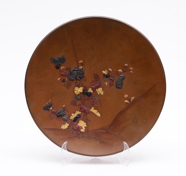 • Antigo e raro prato japonês em bronze da era Meiji com belíssimo trabalho em relevo. Peça em excepcional estado de conservação. Diâmetro: 27 cm.